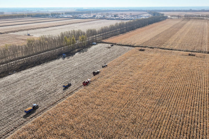 2024年10月16日,在黑龍江省肇東市五里明鎮東升村,農民駕駛農機進行收割作業(無人機照片)。新華社記者 謝劍飛 攝