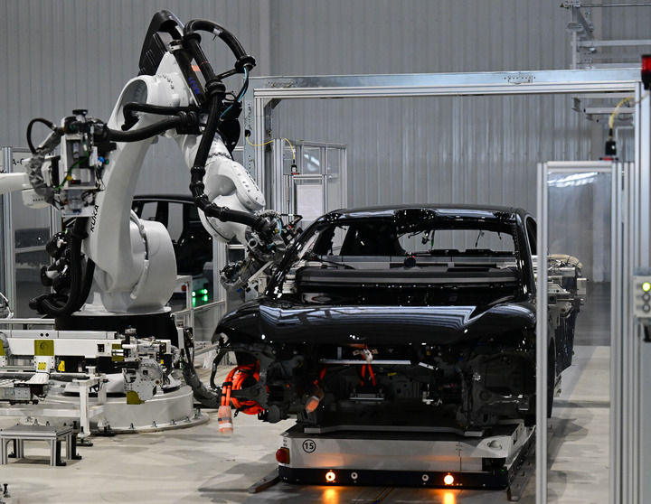 2025年7月1日在合肥市新橋智能電動汽車產業園蔚來第二工廠拍攝的新能源汽車生產線。新華社記者 周牧 攝